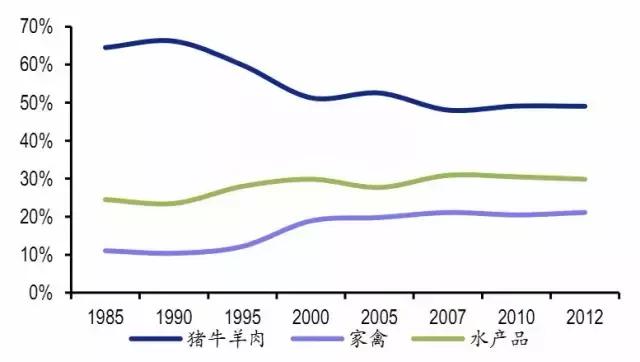 從國內(nèi)肉類消費結(jié)構(gòu)的變化對判斷未來淡水產(chǎn)向海水產(chǎn)消費升級趨勢有較好的參考價值。