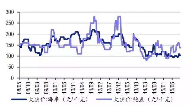 不過在2015年之后,中高端海鮮餐飲也出現(xiàn)了復(fù)蘇的態(tài)勢。以限額以上餐飲來參考中高端餐飲,其2013-2015年收入增速分別為-1.80%、2.23%和7.25%,呈現(xiàn)復(fù)蘇態(tài)勢。中高檔餐飲復(fù)蘇對海水產(chǎn)品尤其相對優(yōu)質(zhì)的中高檔海水產(chǎn)品的需求構(gòu)成正面有力支撐。